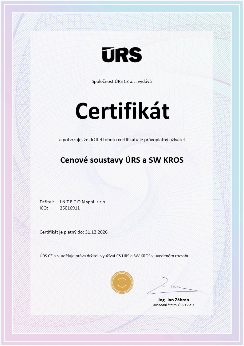 Home > Aktuality > Certifikace INTECONu spol. s r. o. pro rozpočtové práce rok 2026 Certifikace INTECONu spol. s r. o. pro rozpočtové práce rok 2026 18.11.2025 Zpět
